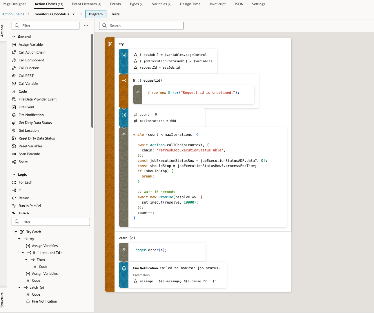 - Use a JavaScript interval to monitor job completion via /rest/scheduler/v1/requests endpoints.